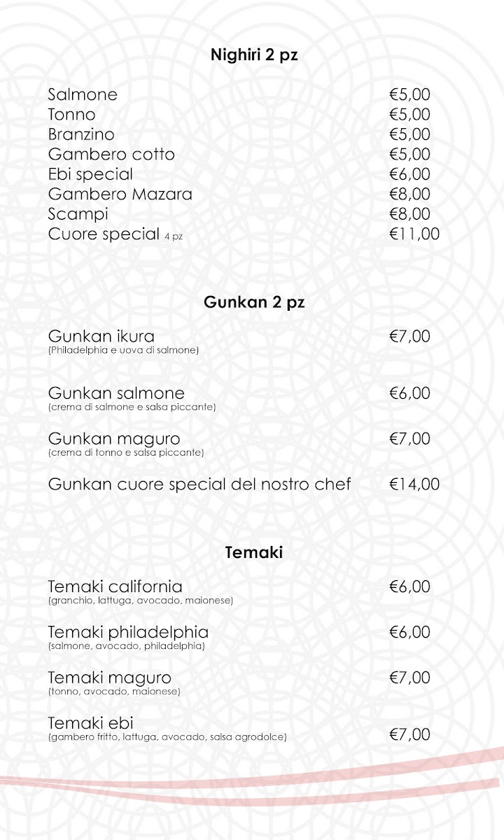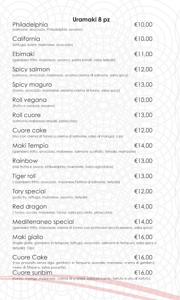 The menu at Cuore Sushi features a variety of traditional and contemporary sushi offerings, complemented by other Japanese dishes. Visitors can expect a selection that includes different types of sushi rolls, sashimi, and cooked items like yakisoba. The menu is designed to accommodate both casual dining experiences and more relaxed meals.